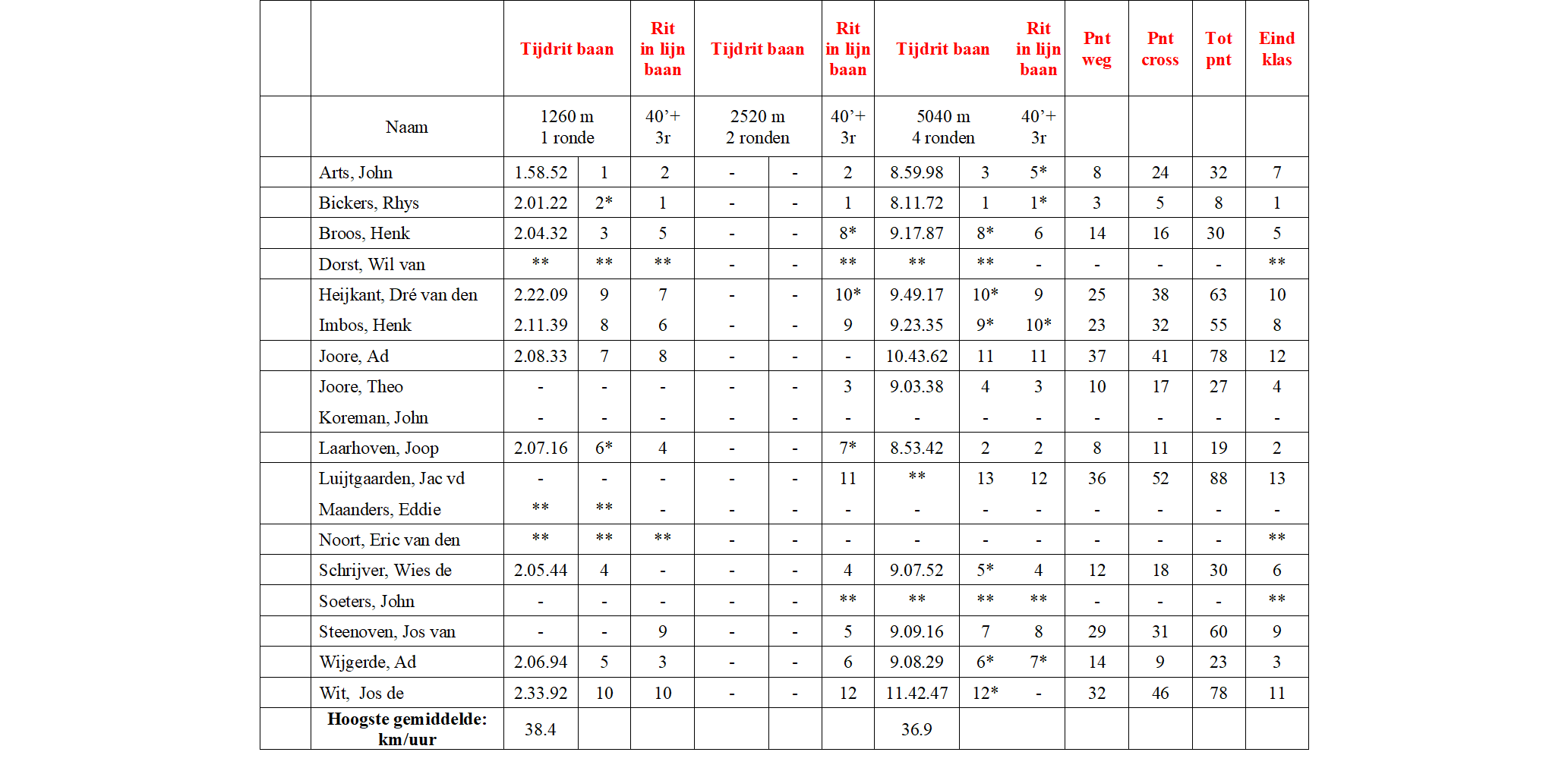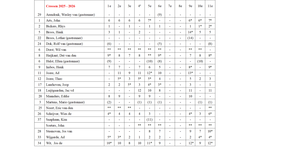 * Laagst geklasseerde wedstrijden vervallen bij meer dan 8x deelname